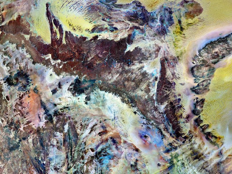 This is planet Earth, specifically the Tassili n'Ajjer National Park, a part of the Sahara Desert, taken by the Landsat 7 satellite. Landsat 7 used a combination of infrared, near-infrared and visible light to better distinguish between the various rock types found in the region. Sand appears in shades of yellow and tan, while granite rocks appear brick red, and blue areas are likely salts. This area has a bone-dry climate with scant rainfall, but is not just a sea of sand like the rest of the Sahara Desert. Instead, the rocky plateau rises above the surrounding sand. Rich in geologic and human history, Tassili n'Ajjer is a United Nations Educational, Scientific and Cultural Organization (UNESCO) World Heritage Site, and covers 27,800 square miles (72,000 square kilometers) in southeastern Algeria.