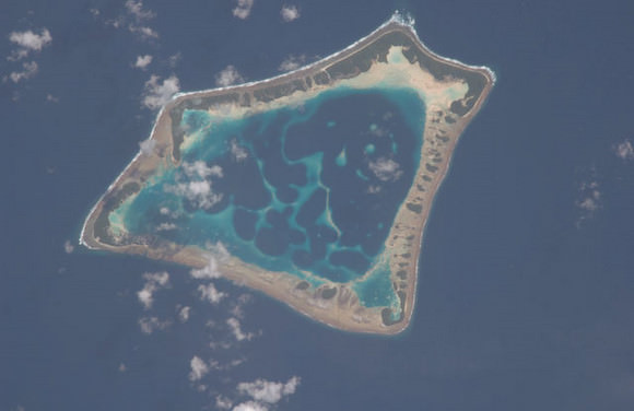 This is the Atafu Atoll in the Southern Pacific Ocean. The image was taken by an ISS crew member from Expedition 18 crewmember. on the International Space Station. The ring-like shape of the atoll is the result of coral reefs building up around a former volcanic island. Over geologic time, the central volcano has subsided beneath the water surface, leaving the fringing reefs and a central lagoon that contains submerged coral reefs. Erosion and soil development on the surfaces of the exposed fringing reefs has lead to formation of tan to light brown beach deposits (southern and western sides of the atoll) and green vegetation cover (northern and eastern sides of the atoll).
