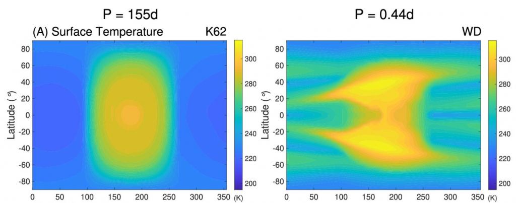 "The synchronously rotating WD planet's global mean surface temperature is 25 K higher than that of the synchronously rotating planet orbiting K62 due to its much faster (10 hr) rotation and orbital period," the authors explain in their paper.