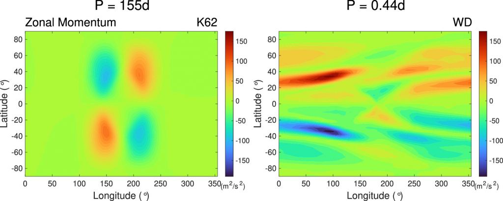 The WD planet's faster rotation circulated the atmosphere more effectively, avoiding the runaway greenhouse effect. "This ultrafast rotation generates strong zonal winds and meridional flux of zonal momentum, stretching out and homogenizing the scale of atmospheric circulation and preventing an equivalent buildup of thick, liquid water clouds on the dayside of the planet compared to the synchronous planet orbiting K62," the paper states. The authors also explain that this transports heat from higher latitudes toward the equator and that this pattern is seen in other simulations of short-period planets.