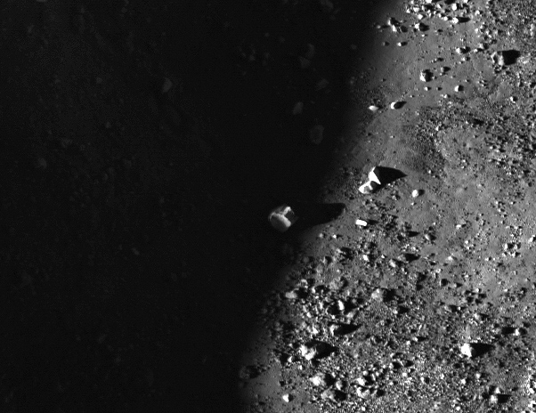 A lunar boulder catches the last edge of the setting sunlight in this image from the Lunar Reconnaissance Orbiter Camera. The boulders litter the floor of an unnamed 3.5 km wide (2.17 mile wide) crater located within the much larger crater Lobachevskiy. The smaller crater's rim casts its shadow along the left side of the image, and raises the question: why are shadows on the Moon so dark?