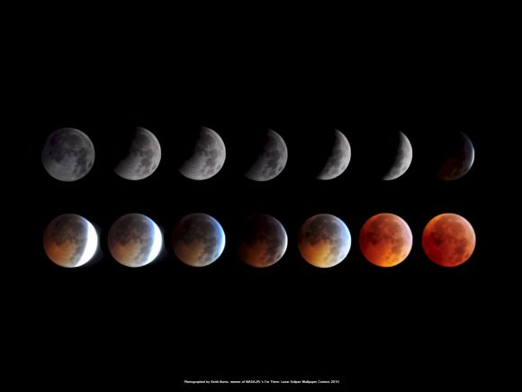 The phases of a lunar eclipse. Photo credit: Keith Burns for NASA/JPL