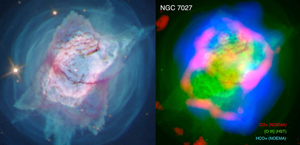 "We're very excited about these findings," said Bublitz. "We had hoped to find structure that clearly showed CO+ and HCO+ spatially coincident or entirely in distinctive regions, which we did. This is the first map of NGC 7027, or any planetary nebula, in the molecule CO+, and only the second CO+ map of any astronomical source."