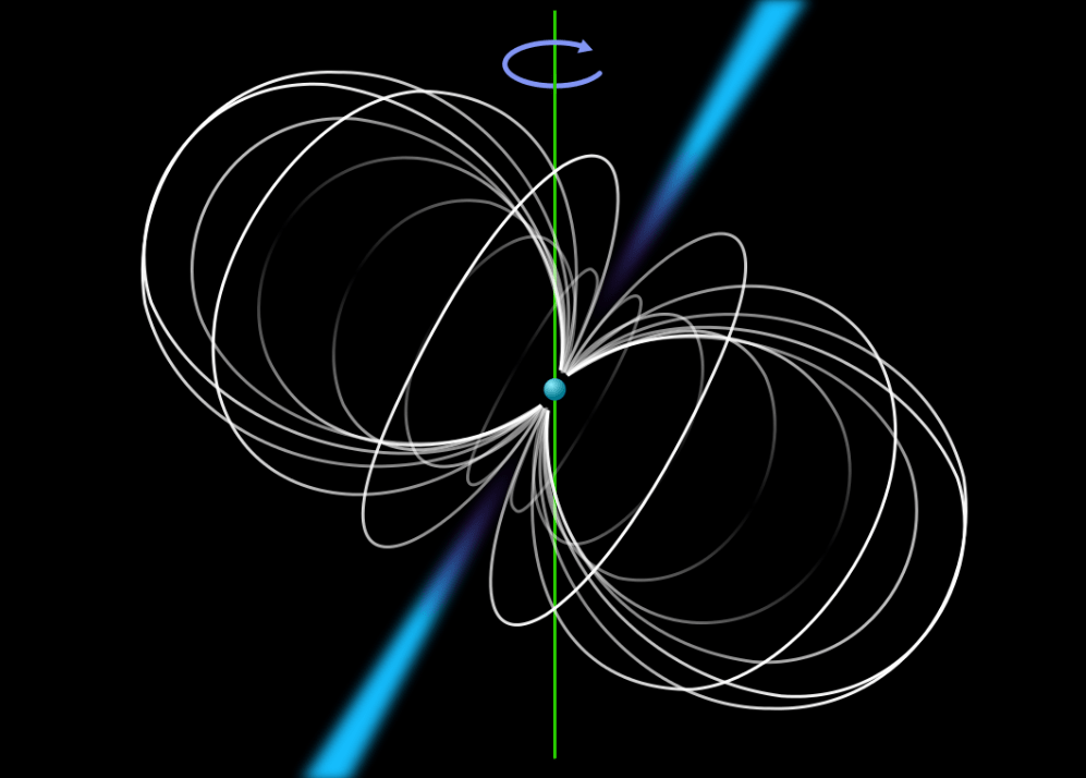 Now, the neutron star has much less volume(and mass) than its progenitor, and like a figure skater who pulls their arms in while spinning, the spin rate increases. It's called the " conservation of angular momentum," a concept that comes up repeatedly in astronomy and astrophysics.