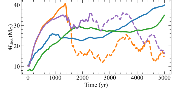 The results also show that in both simulations that include magnetic fields, the amount of mass that reaches the envelope initially increases, then declines. However, the results were different in the simulations without magnetic fields. In those simulations, mass transfer from the envelope to the accretion disk is fast at first, creating a decline in the mass in the envelope and a build-up of mass in the disk. "This mass is consequently accreted by the star at a high rate," the authors write.