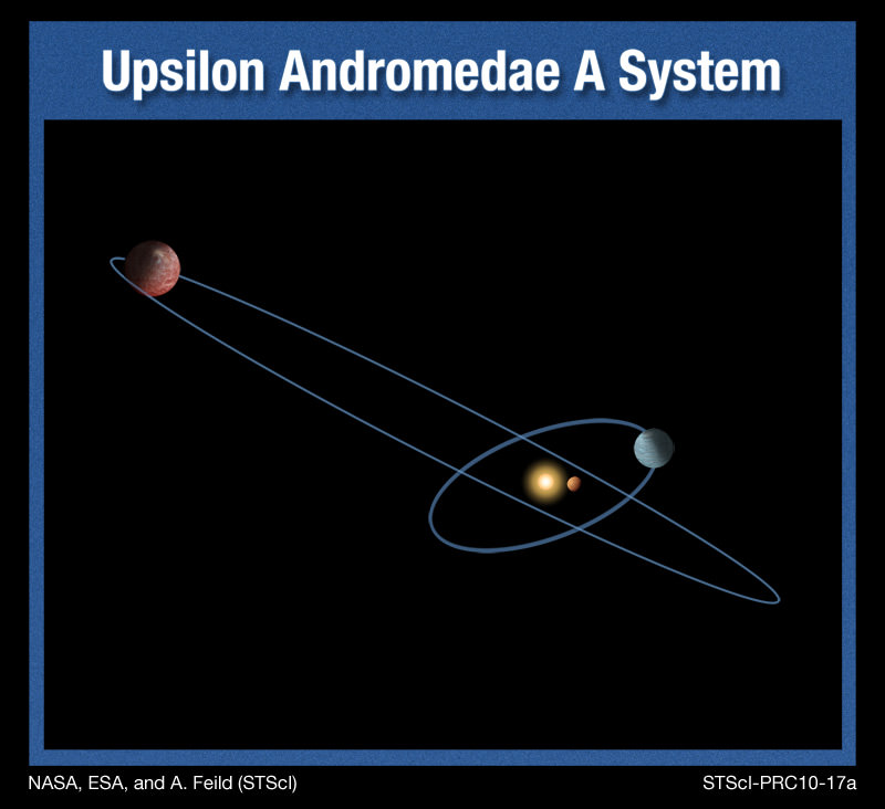 A close look at the Upsilon Andromedae system with the Hubble Space Telescope, the Hobby-Eberly Telescope and other ground-based telescopes shows a whacky system where planets are out of tilt and have highly inclined orbits. The astronomers also found another planet, and also another star – this is likely a binary star system.