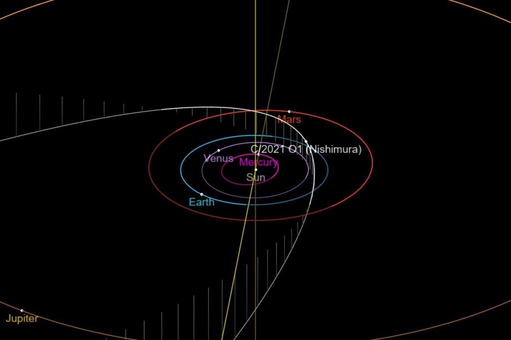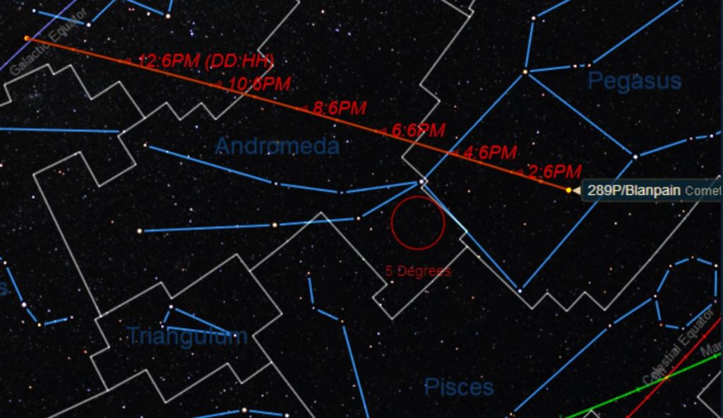Orbiting the Sun once every 5.2 years, Blanpain will only be of interest if it produces another outburst. Blanpain reaches perihelion 0.891 Astronomical Units (1 AU equals 93 million miles) from the Sun on December 20thwhen it's 0.18 AU from Earth, and is favorable through early January as it races northward through the constellations Pegasus, Andromeda and Cassiopeia.