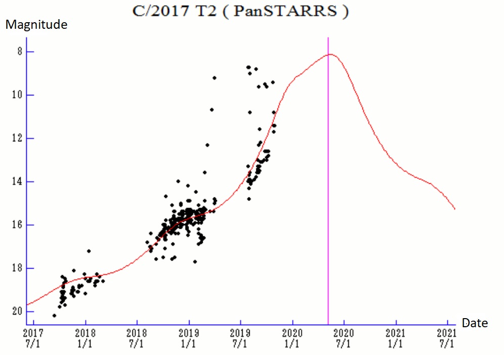 First, Comet 2017 T2 PanSTARRS may top out at +8thmagnitude in the Spring. T2 PanSTARRS reaches perihelion on May 6th, 1.6 AU from the Sun. The comet passes 1.52 AU from Earth on New Year's Eve 2019. At perihelion, T2 PanSTARRS will be moving just under a degree a day (twice the apparent diameter of a Full Moon) through the constellation of Ursa Major, the Great Bear. T2 PanSTARRS is on a just under 10,000 year long orbit. This will make T2 PanSTARRS a fine circumpolar object for northern hemisphere observers, during short summer evenings.