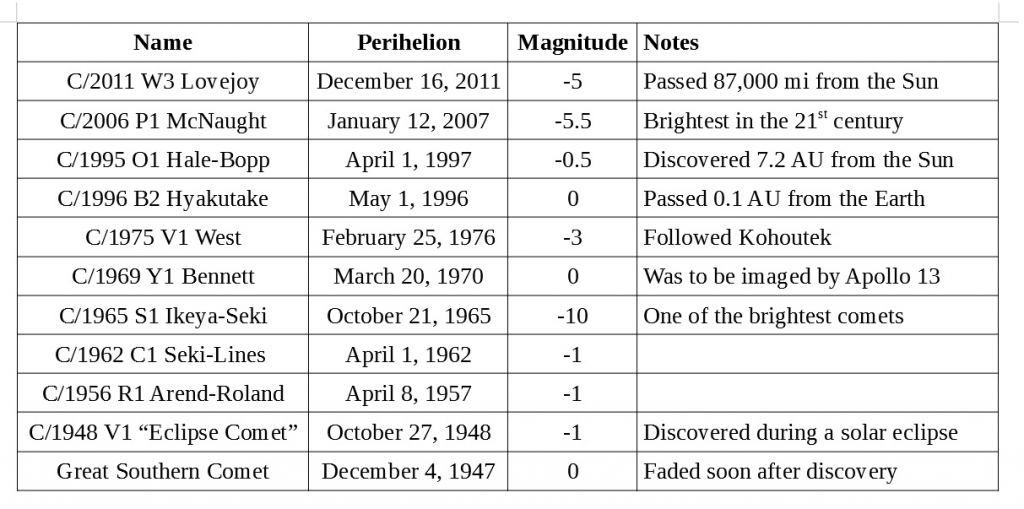 This was adapted from our 'bright comets of the past century' table from our book, The Universe Today’s Guide to Viewing the Cosmos.