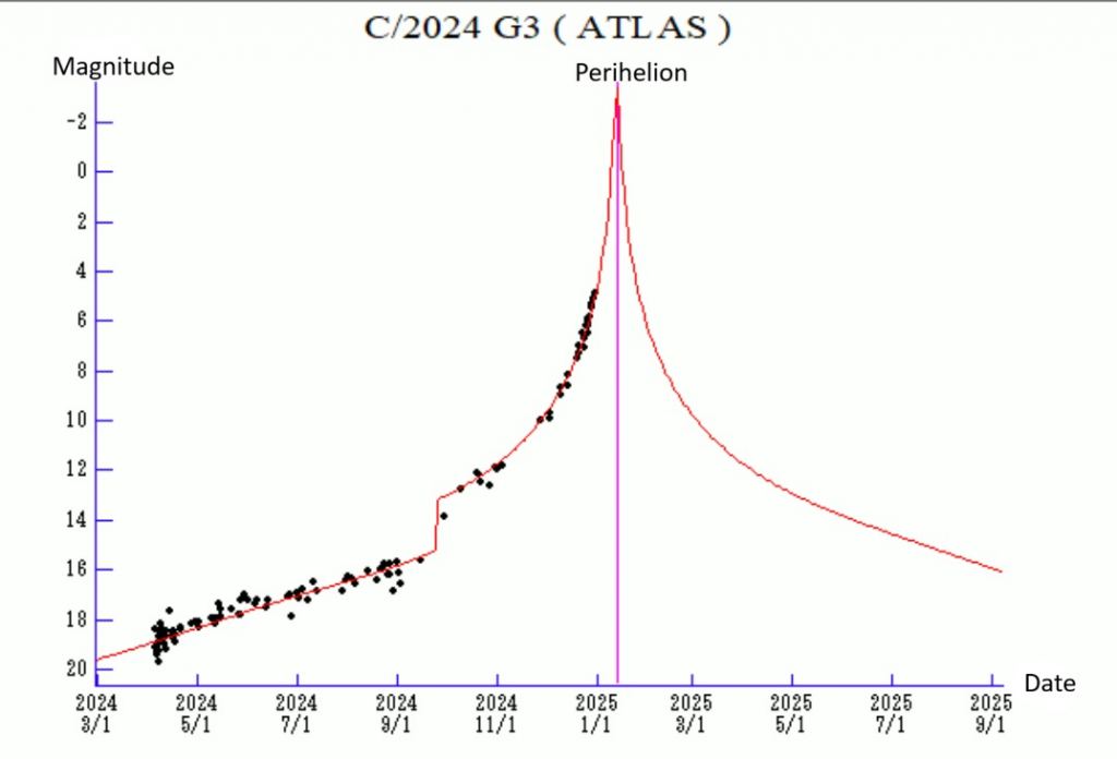 The comet actually produced an outburst over the first weekend of 2025, jumping from magnitude +4 to +1 (a sixteen-fold increase in brightness in a few short days). This could be a harbinger for good (or bad) things to come shortly.