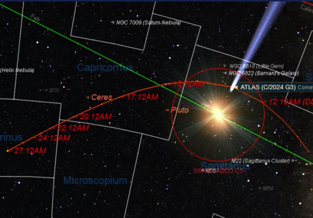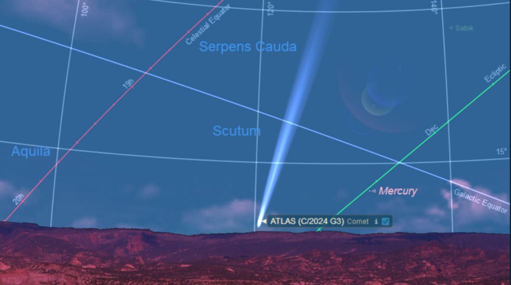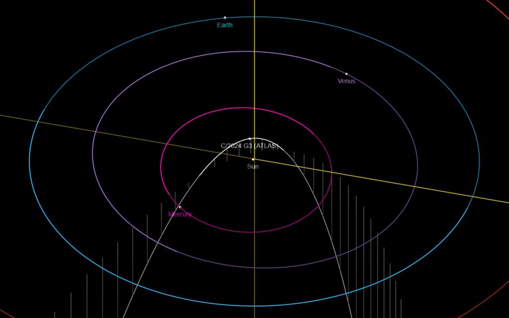 A daytime comet could be in the offing if G3 ATLAS over-performs at perihelion… but it will be a challenging view, very near the Sun. Be sure to block the dangerous glare of the Sun fully out of view behind a building or structure if you attempt to spot the comet in daylight. Like A3 T-ATLAS, the joint NASA/ESA SOHO observatory will see the comet near perihelion crossing through its LASCO C3 viewer.