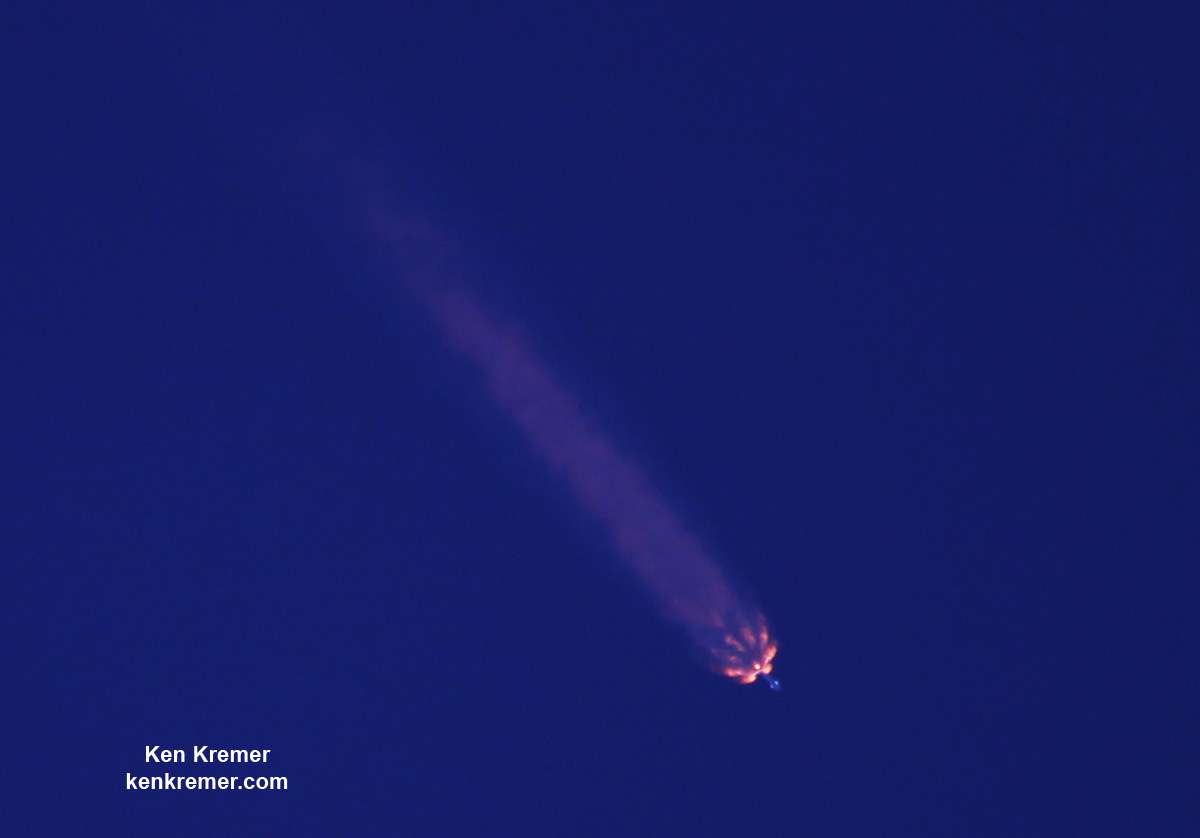Blastoff of SpaceX Falcon 9 rocket at 7:20 p.m. EDT from Launch Complex 39A on 15 May 2017 from NASA's Kennedy Space Center in Florida which successfully delivered Inmarsat-5 F4 broadband satellite to orbit. Credit: Julian Leek