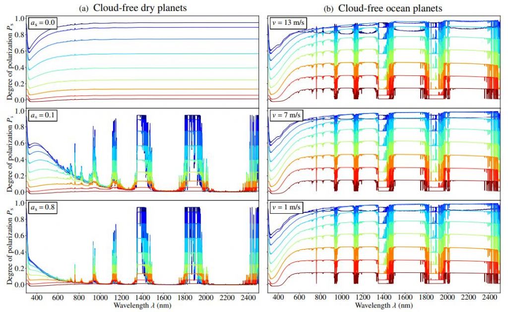 One of the main takeaways from this work concerns the degree of polarization or P s. The image below compares the P sfor cloud-free dry planets vs cloud-free ocean planets.