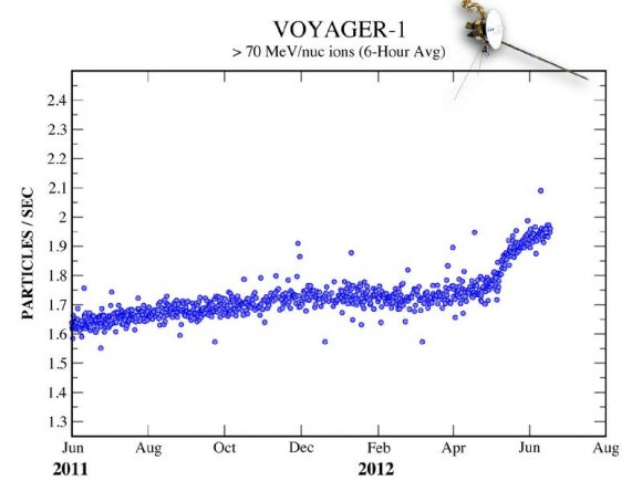 Data sent from Voyager 1 — a trip that currently takes the information nearly 17 hours to make — have shown steadily increasing levels of cosmic radiation as the spacecraft moves farther from the Sun. But on July 28, the levels of high-energy cosmic particles detected by Voyager jumped by 5 percent, with levels of lower-energy radiation from the Sun dropping by nearly half later the same day. Within three days both levels had returned to their previous states.