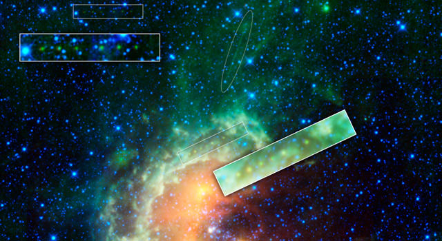 The Tadpole nebula is looking very stylish in this new infrared image from the WISE spacecraft, NASA's Wide-field Infrared Survey Explorer. An asteroid appears like a string of pearls -- seen as a line of yellow-green dots in the boxes near center -- in this stitched together mosaic. The Tadpole is a star-forming region in the Auriga constellation about 12,000 light-years from Earth. As WISE scanned the sky, it happened to catch asteroid 1719 Jens in action, moving across WISE's field of view. A second asteroid was also observed cruising by, as highlighted in the boxes near the upper left (the larger boxes are blown-up versions of the smaller ones).