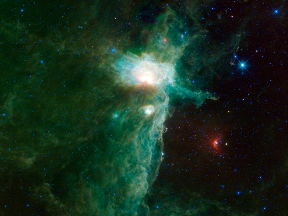 Shining brightly in infrared radiation, the Flame nebula (NGC 2024) is at the heart of the cloud. Just below it is the reflection nebula NGC 2023, and the small, bright loop protruding from the edge of the gas and dust cloud just to its lower right is the Horsehead nebula -- whose famous equine profile appears quite different in infrared light than it does in