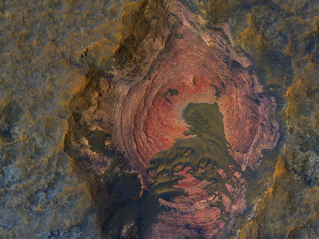 (MRO) is our candy store for stunning images of Mars. Recently, HiRise gave us this stunning image (above) of colorful, layered bedrock on the surface of Mars. Notice the dunes in the center. The colors are enhanced, which makes the images more useful scientifically, but it's still amazing.