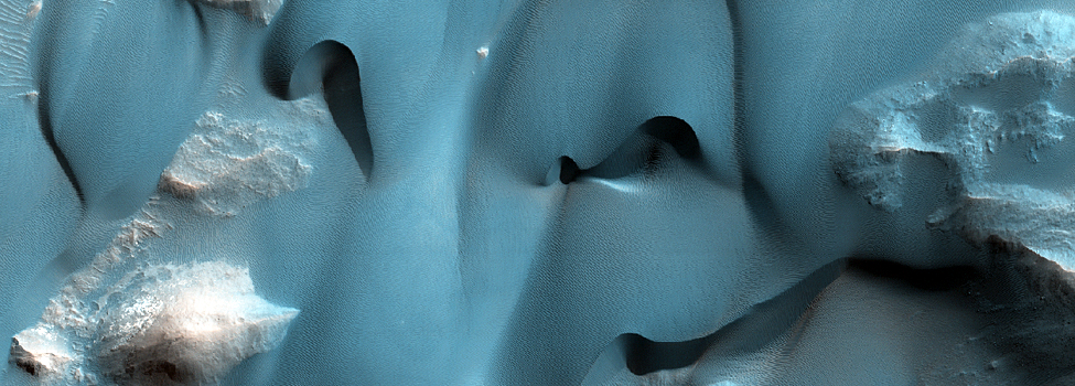 , the massive canyon system that dwarfs the Grand Canyon here on Earth. HiRise captured this image of delicate dune features inside Valles Marineris.
