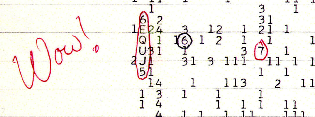 Ehman's searches turned up mostly background noise, but that mid-August night he spotted a surprise — a vertical column with the alphanumerical sequence "6EQUJ5" that indicated a strong signal at hydrogen's frequency. Exactly as predicted. Big Ear picked up the signal from near the 5th magnitude star