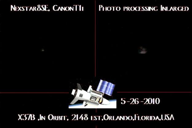 reports that the plane has been spotted again by a skywatcher from South Africa, Greg Roberts on October 12. Spaceweather says, "An analysis of the sighting by satellite expert Ted Molczan suggests that the X-37B has maneuvered into an orbit 54 km lower than before." This is at least the second time the space plane's orbit has changed, but at least we now know it is still in orbit and hasn't landed.