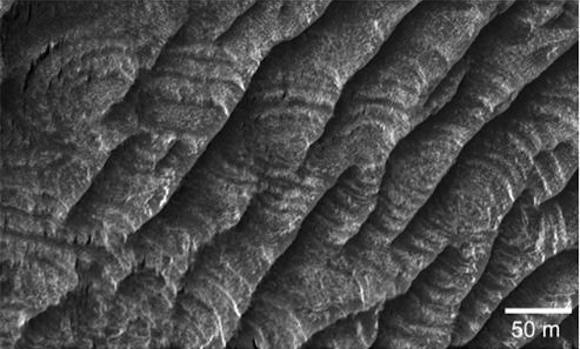 These structures are known as periodic bedrock ridges. They look like sand dunes on the surface of Mars, but instead of sand piled high by strong winds, it appears that the wind has carved dune-like ridges right into the Martian bedrock.