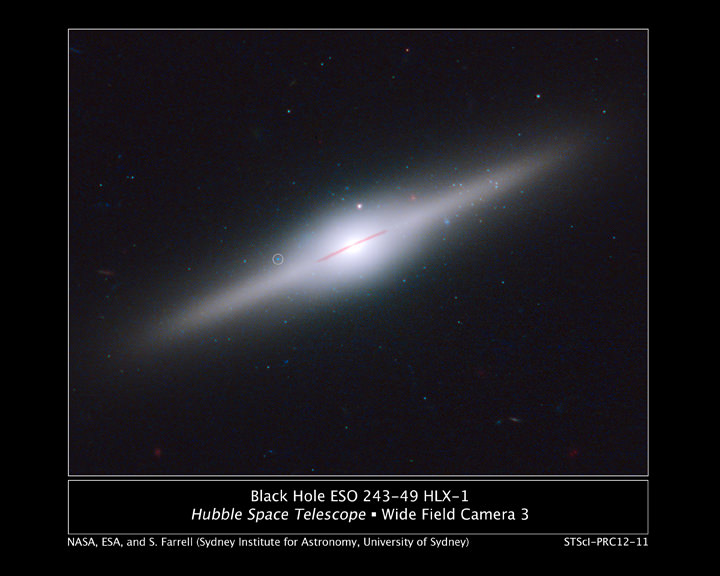 Designated as ESO 243-49 HLX-1, this incredible intermediate mass black hole was discovered in 2009 by Sean Farrell, of the Sydney Institute for Astronomy in Australia, using the European Space Agency's XMM-Newton X-ray space telescope. Hyper-Luminous X-ray Source 1 is a 20,000 solar mass beauty which resides at the edge of galaxy ESO 243-49 some 290 million light years away. However, the Newton's findings weren't the only contribution - HLX-1 was also verified with NASA's Swift observatory in X-ray and Hubble in near-infrared, optical, and ultraviolet wavelengths. What stands out is the presence of a cluster of young stars encircling the black hole and stretching out across about 250 light years of space. While the stars themselves are too far away to be resolved, their magnitude and spectra match with other young clusters seen in similar galaxies.