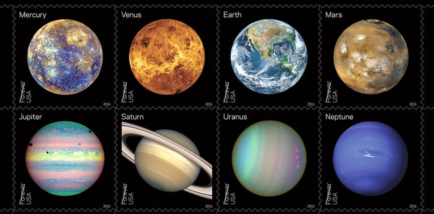 The Postal Service will showcase some of the more compelling historic, full-disk images of the planets obtained during the last half-century of space exploration. Some show the planets' "true color" like Earth and Mars — what one might see if traveling through space. Others, such as Venus, use colors to represent and visualize certain features of a planet based in imaging data. Still others (red storms on Uranus) use the near-infrared spectrum to show things invisible to the human eye.