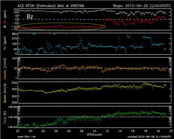 Ace realtime data page. When the Bz dropped to -10 and lower (outlined in yellow), the sun's local magnetic field linked up with Earth's to produce a nice aurora on June 28-29, 2013. Credit: NASA[/caption]