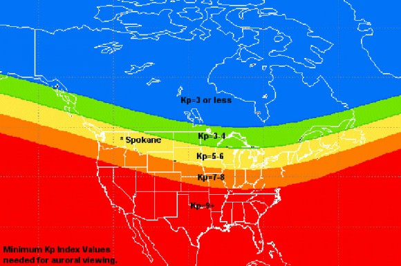 This map gives you an idea of what the Kp index has to be for auroras to show at U.S. and Canadian locations. Credit: NOAA[/caption]