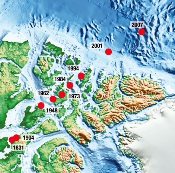 The geomagnetic pole wanders with time. It's presently in the Canadian Arctic. Credit: Arnaud Chulliat, Institut de Physique du Globe de Paris[/caption]