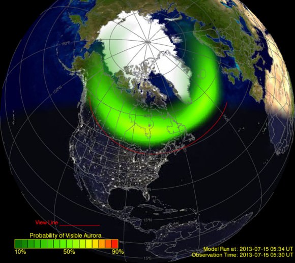 Depiction of the northern auroral oval from the Ovation site on July 15, 2013. Southern Canada and the northern fringe of the U.S. were under the oval with northern lights visible. The red "view line" shows how far south the aurora could be seen that night. The Ovation site also includes a depiction of the southern oval. Credit: NOAA[/caption]