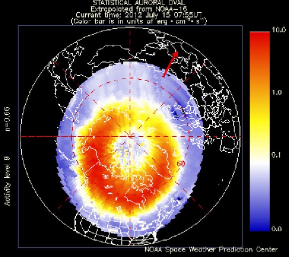 The POES auroral oval map on July 15, 2012 showing how the oval expanded well into the northern U.S. to create a spectacular auroral display. The CME in the July 6 animation above was responsible for the activity. Credit: NOAA[/caption]