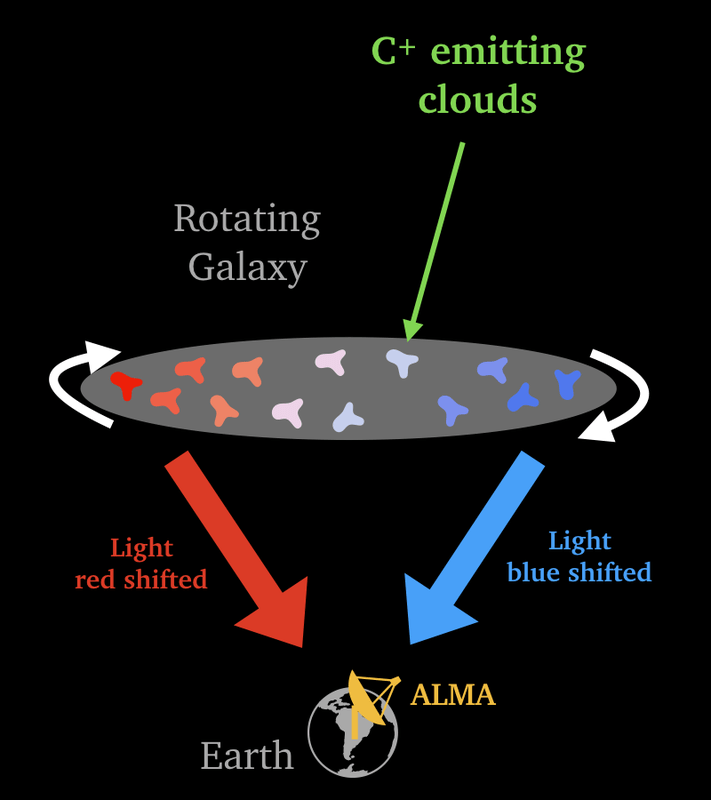 One of the key functions of this survey was to use ALMA to spot the emission line of C+ atoms, a positively charged form of carbon that is created when ultraviolet light from newborn stars interacts with clouds dust. By measuring the signature of this atom in galaxies, astronomers can see how the galaxies are rotating.