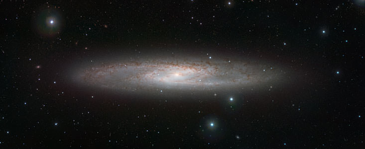 [/caption] The Sculptor Galaxy (NGC 253) lies in the constellation of the same name and is one of the brightest galaxies in the sky. It is prominent enough to be seen with good binoculars and was discovered by Caroline Herschel from England in 1783. NGC 253 is a spiral galaxy that lies about 13 million light-years away. It is the brightest member of a small collection of galaxies called the Sculptor Group, one of the closest such groupings to our own Local Group of galaxies. Part of its visual prominence comes from its status as a starburst galaxy, one in the throes of rapid star formation. NGC 253 is also very dusty, which obscures the view of many parts of the galaxy. Seen from Earth, the galaxy is almost edge on, with the spiral arms clearly visible in the outer parts, along with a bright core at its center.