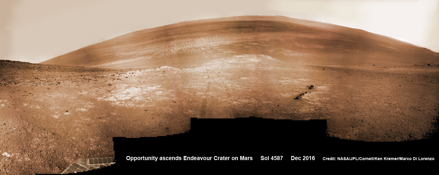 On the brink of 4600 Sols of a profoundly impactful life, NASA's long lived Opportunity rover celebrates the Christmas/New Year's holiday season on Mars marching relentlessly towards an ancient water carved gully along the eroded rim of vast Endeavour crater - the next science target on her heroic journey traversing across never before seen Red Planet terrains.
