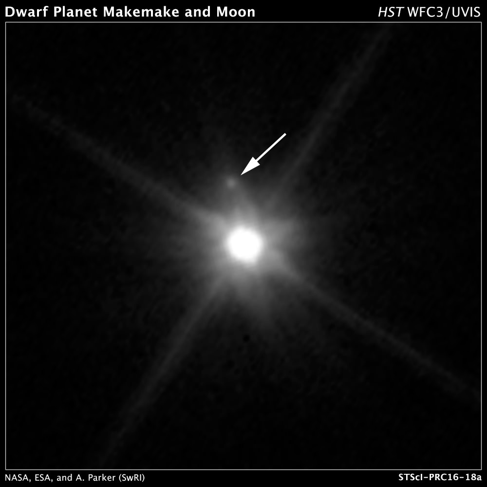 Planetary scientists using the Hubble Space Telescope have spotted a dark mini-moon orbiting the distant dwarf planet Makemake. The moon, nicknamed MK 2, is roughly 160 km (100 miles) wide and orbits about 20,000 km (13,000 miles) from Makemake.