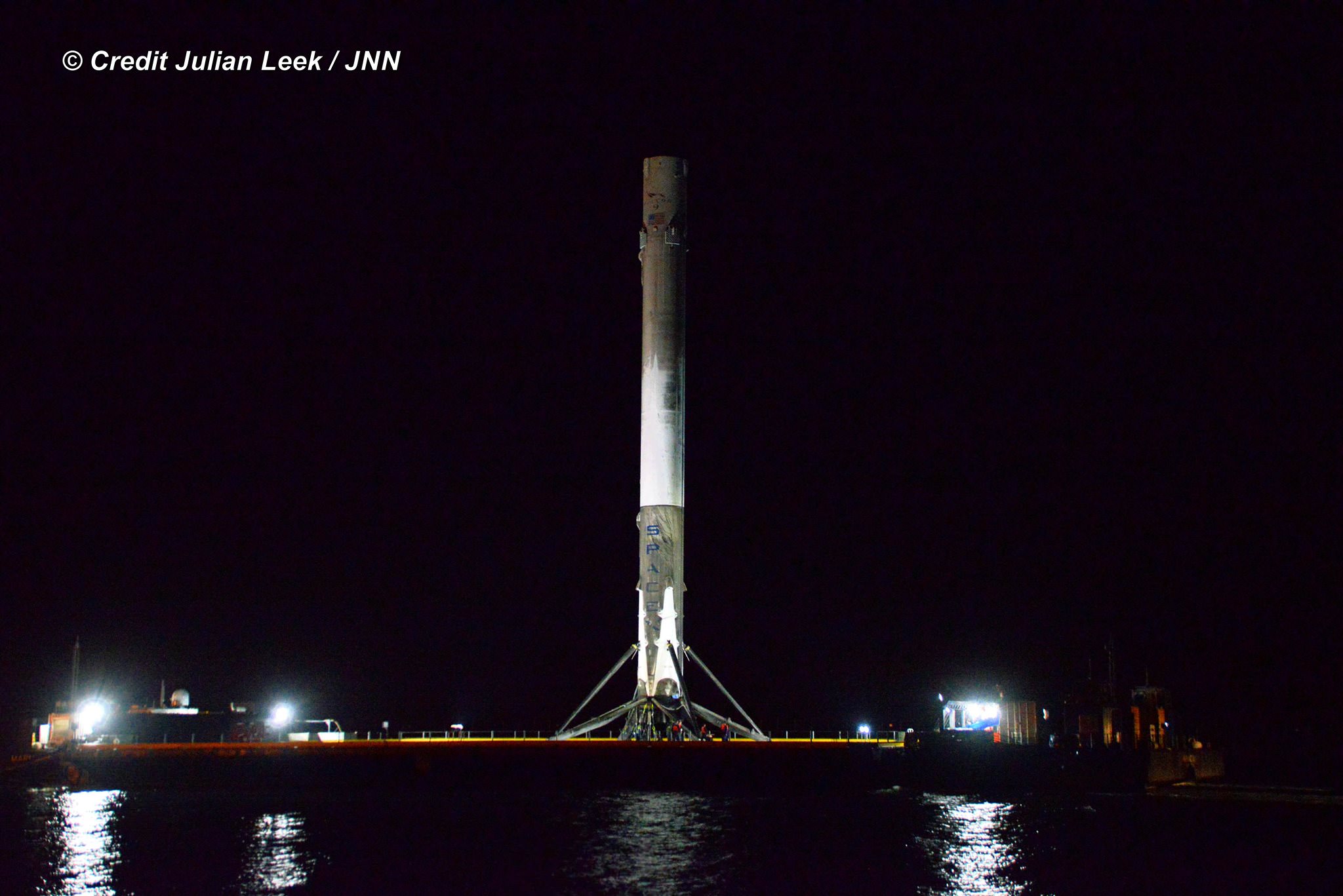 The SpaceX Falcon 9 that triumphantly accomplished history's first upright landing of the spent first stage of a rocket on a barge at sea - after launching a critical cargo payload to orbit for NASA - sailed back into port at Cape Canaveral overnight in the wee hours of this morning, April 12, standing tall.