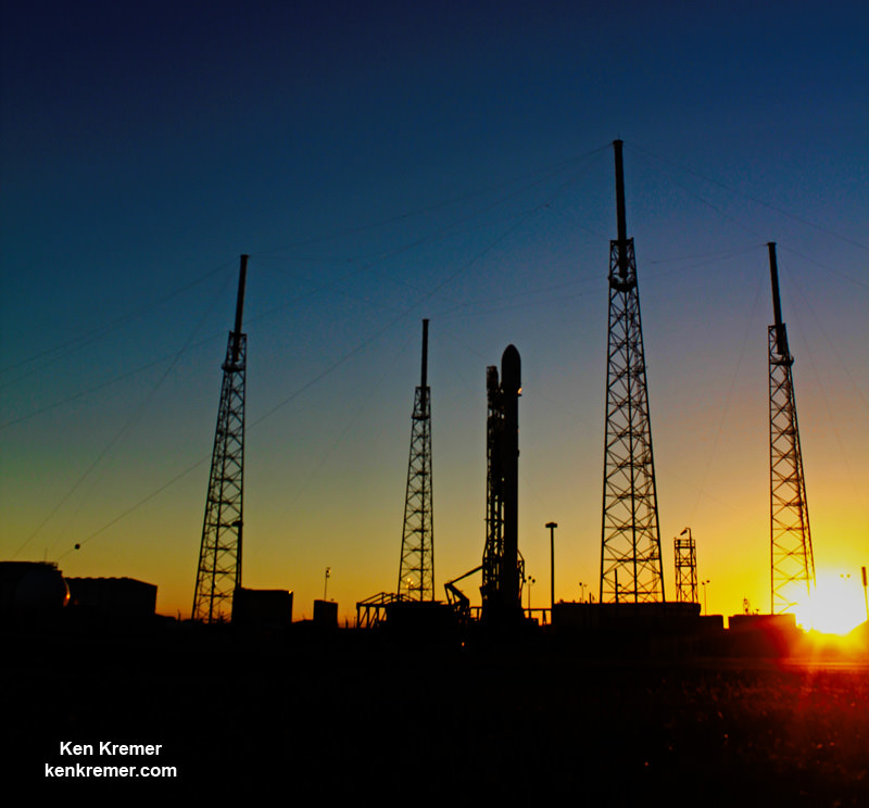 CAPE CANAVERAL AIR FORCE STATION, FL - Following a pair of back to back launch scrubs this week on Wednesday and Thursday due to rocket fueling issues with the liquid oxygen propellant, SpaceX has reset the blast off of their upgraded Falcon 9 rocket - carrying the commercial SES-9 television and communications satellite - to coincidentally coincide with a serene sunset on Sunday, Feb. 28.