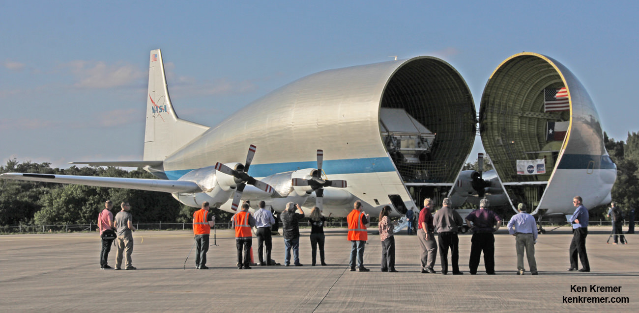 KENNEDY SPACE CENTER - Looking amazingly like a fish flying across the skies high above the Florida space coast, NASA's unique Super Guppy aircraft loaded with the structural backbone for NASA's next Orion crew module, swooped in for a landing at the Kennedy Space Center on Monday afternoon, Feb. 1.